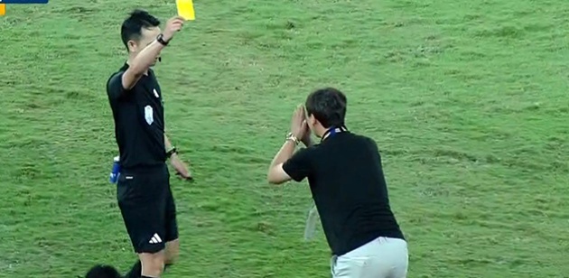 HLV Kim Sang-sik liên tục ra sát đường biên, phản ánh với trọng tài. Sau nhiều lần nhắc nhở, ông bị rút thẻ vàng cảnh cáo. Tuy nhiên, thay vì nổi giận hay tranh cãi, ông thầy người Hàn Quốc lại bất ngờ mỉm cười và chắp tay “vái lạy” trọng tài với thái độ vừa châm biếm, vừa bất lực.