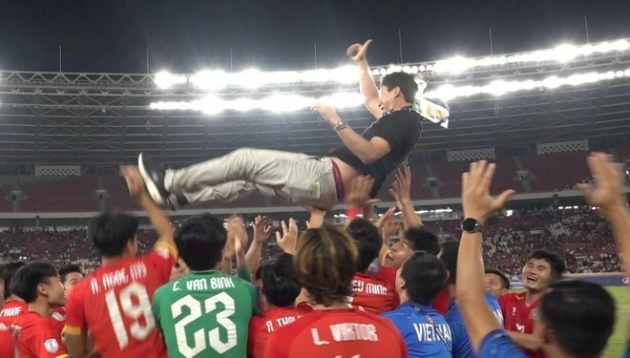 Ông Kim té khi được công kênh.Sau chiến thắng 1-0 đầy quả cảm trước U23 Indonesia ở chung kết U23 Đông Nam Á 2025, các cầu thủ Việt Nam đã cùng nhau ăn mừng theo cách đặc biệt: công kênh HLV Kim Sang-sik và tung ông lên không trung giữa sân Bung Karno.