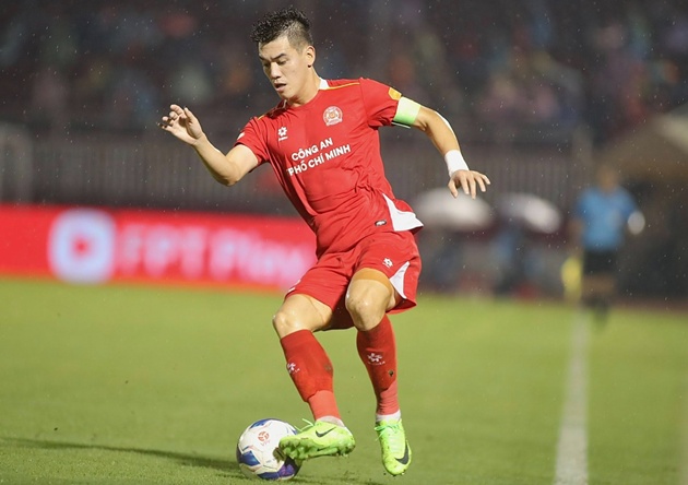 Quốc Cường đưa chủ nhà vượt lên dẫn 1-0. Ảnh: Fanpage CLB CA TP.HCM.Bàn thắng sớm giúp đội bóng áo đỏ chơi hứng khởi, và họ suýt nhân đôi cách biệt ở phút 37. Trong tình huống phối hợp mẫu mực bên cánh phải, Quang Hùng căng ngang loại bỏ toàn bộ hàng thủ Hải Phòng, nhưng Tiến Linh lại sút hụt bóng trước khung thành trống, khiến cơ hội vàng trôi qua trong tiếc nuối.