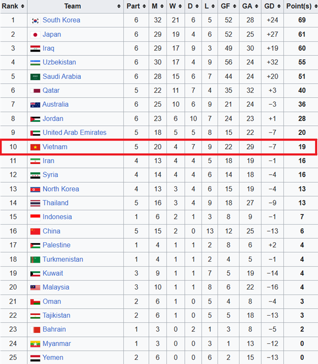 U23 Việt Nam xếp thứ 10 ở châu Á và đứng đầu Đông Nam Á.BXH tổng hợp thành tích giải U23 châu Á vừa được công bố dựa trên phong độ của các đội tuyển từng lọt vào vòng chung kết. Cách tính điểm được quy định cụ thể: một trận thắng được 3 điểm, trận hòa 1 điểm và thua 0 điểm. Nếu các đội bằng điểm, hiệu số bàn thắng bại sẽ được xét đến để phân định thứ hạng.