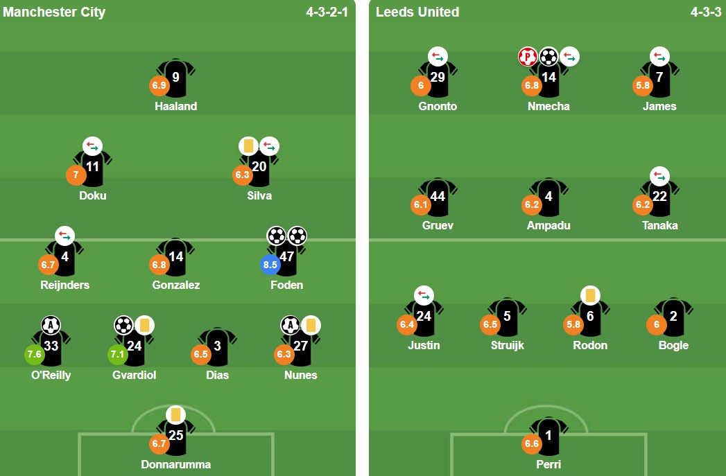 Foden có điểm số cao vượt trội.Trong ngày Manchester City trải qua một trận đấu đầy biến động trước Leeds United, ngôi sao người Anh trở thành nhân vật định đoạt số phận trận đấu bằng cú đúp và màn trình diễn toàn diện trải dài suốt 90 phút. BongDa.Com.Vn chấm Foden 8,5 điểm, cao nhất trên sân và vượt xa phần còn lại, phản ánh trọn vẹn tầm ảnh hưởng của anh vào chiến thắng nghẹt thở của đội bóng chủ sân Etihad.