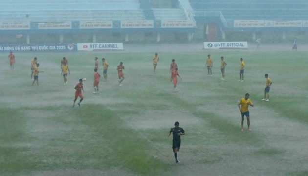 Cầu thủ hai bên thi đấu dưới trời mưa lớn.Một quyết định chưa từng có tiền lệ đã được Liên đoàn Bóng đá Việt Nam (VFF) đưa ra liên quan đến cuộc đọ sức giữa đội Vĩnh Long và Kon Tum tại Giải hạng nhì quốc gia.